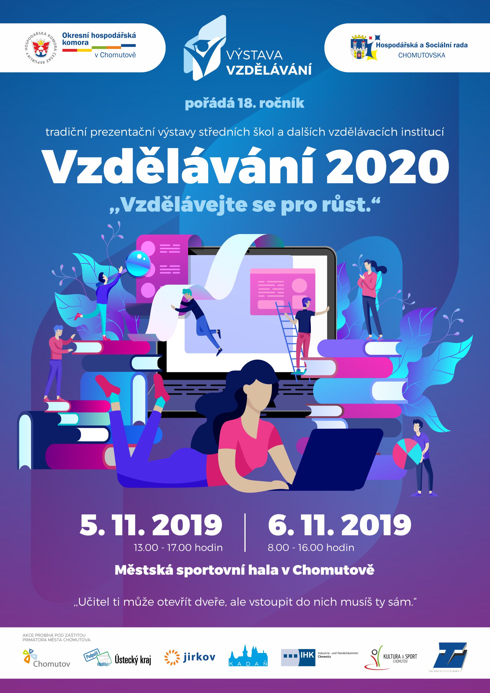 Výstava Vzdělávání 2020 Rodiče, přemýšlíte o budoucnosti svého potomka? Výstava Vzdělávání Vám může pomoci…. Na 30 středních škol na jednom místě. Přijďte se informovat co nabízejí různé obory. 5. a 6. listopadu se na Vás těšíme.