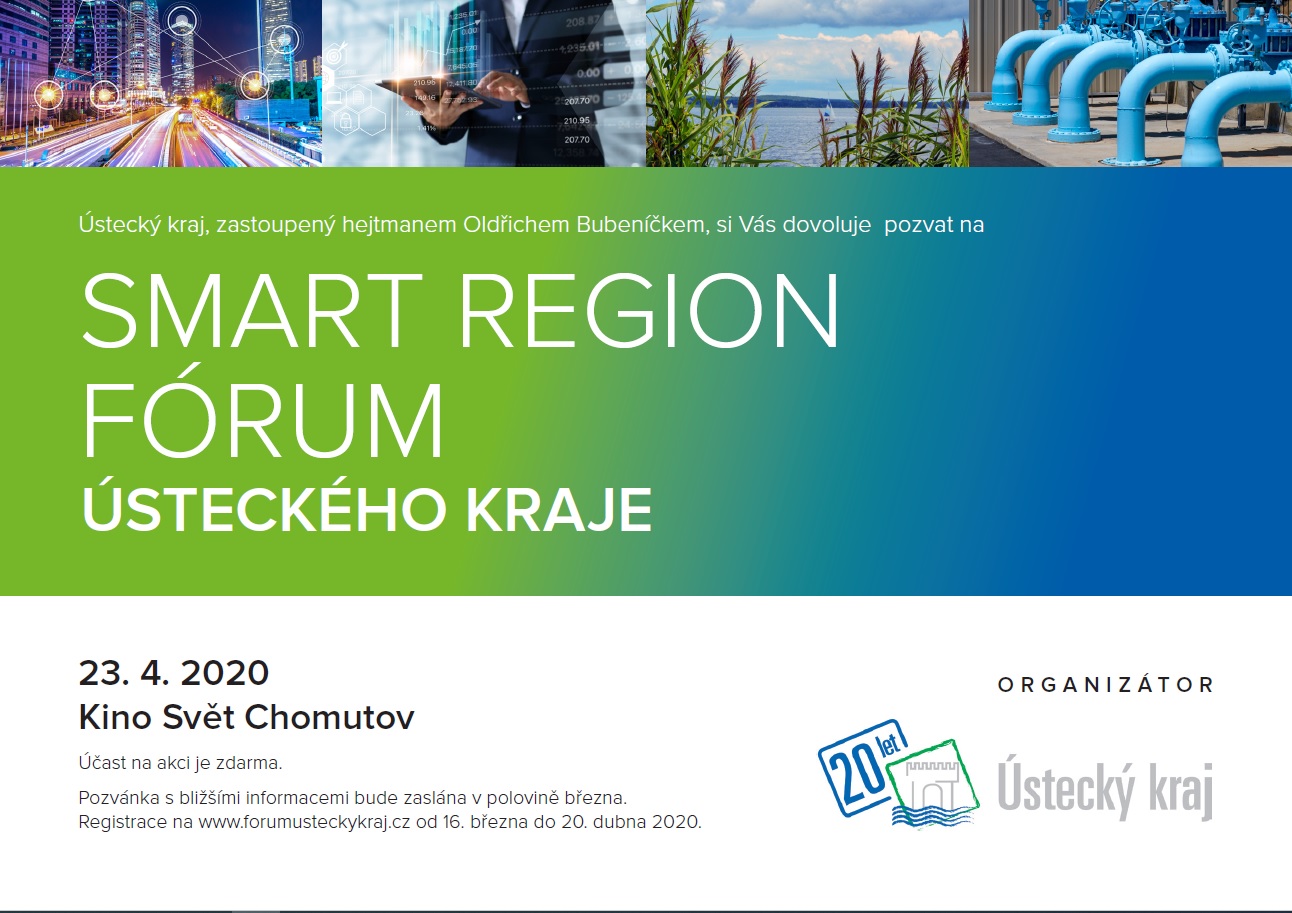 SMART REGION FÓRUM Ústecký kraj, zastoupený hejtmanem Oldřichem Bubeníčkem, si Vás dovoluje pozvat na SMART REGION FÓRUM ÚSTECKÉHO KRAJE. Fórum se koná dne 23.4.2020 v prostorách Kina Svět Chomutov.