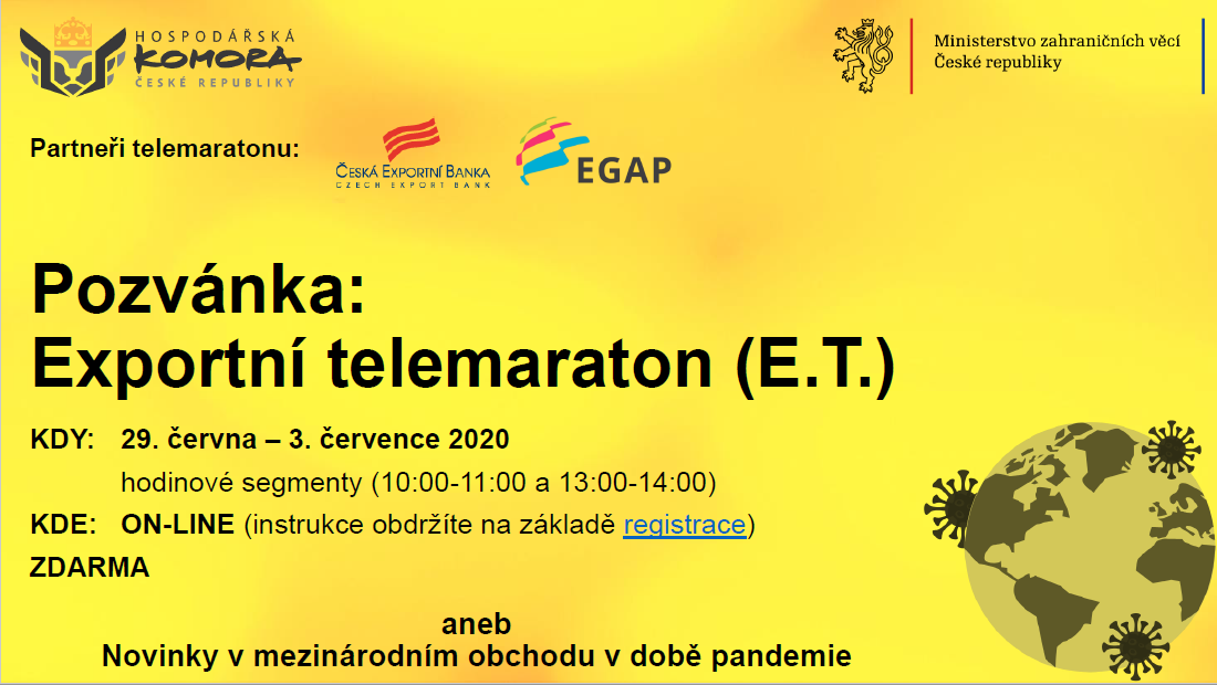 V termínu od 29.6. do 3.7.2020 se uskuteční „Exportní telemaraton aneb Novinky v mezinárodním obchodu v době pandemie 2“.