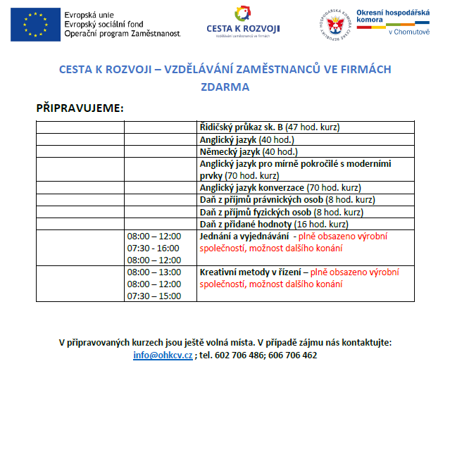 Vzdělávání zaměstnanců ve firmách ZDARMA – harmonogram 2021 Nabídka vzdělávacích kurzů v rámci projektu CESTA K ROZVOJI – vzdělávání zaměstnanců ve firmách ZDARMA na rok 2021.