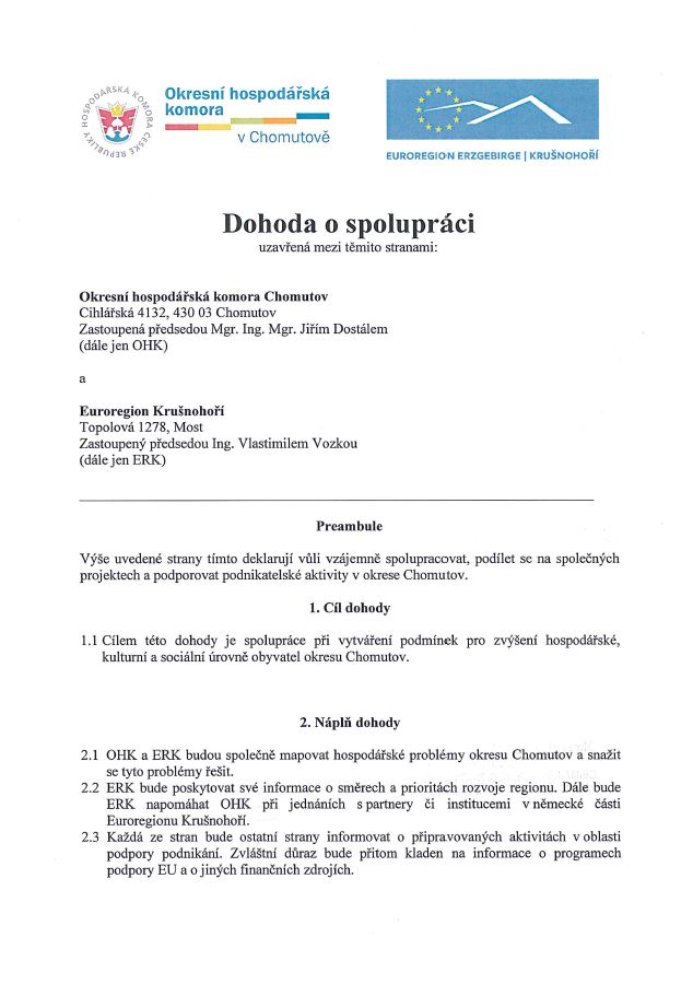 Dohoda o spolupráci OHK v Chomutově a Euroregion Krušnohoří