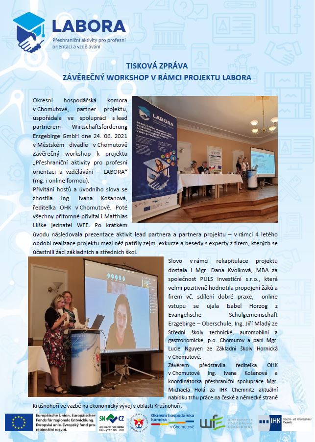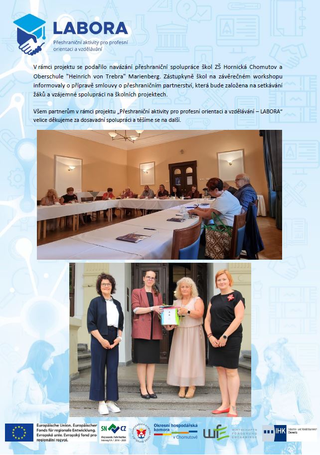 Ve čtvrtek 24. 06. se uskutečnil závěrečný workshop v rámci projektu Labora. Workshop probíhal v prostorách Městského divadla v Chomutově. Někteří účastníci byli připojeni online. V rámci projektu bylo předjednáno partnerství mezi ZŠ Hornická v Chomutově a Heinrich-von-Trebra-Oberschule Marienberg.