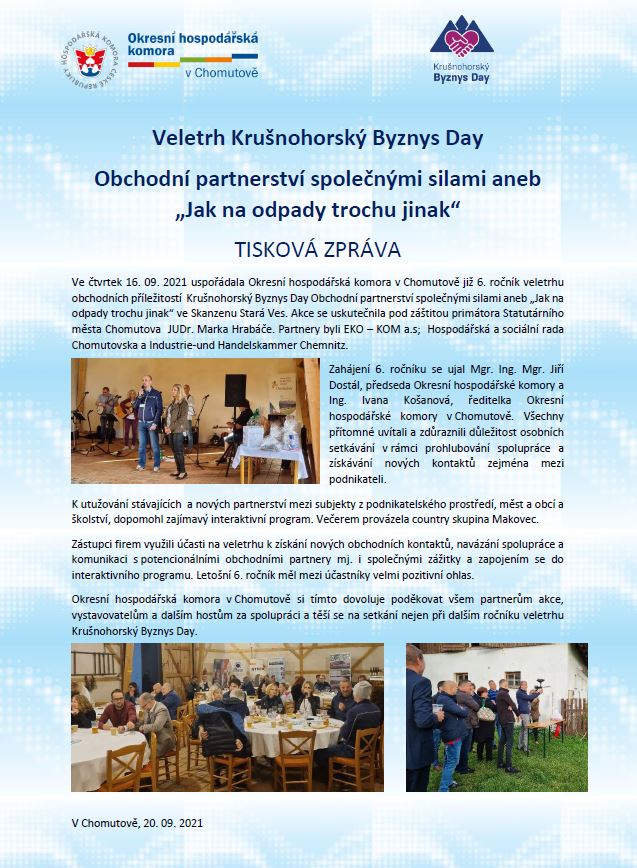 Ve čtvrtek 16.9.2021 se v prostorách Skanzenu Stará Ves uskutečnil 6.  ročník veletrhu Krušnohorský Byznys Day Obchodní partnerství společnými silami ane „Jak na odpady trochu jinak“ :