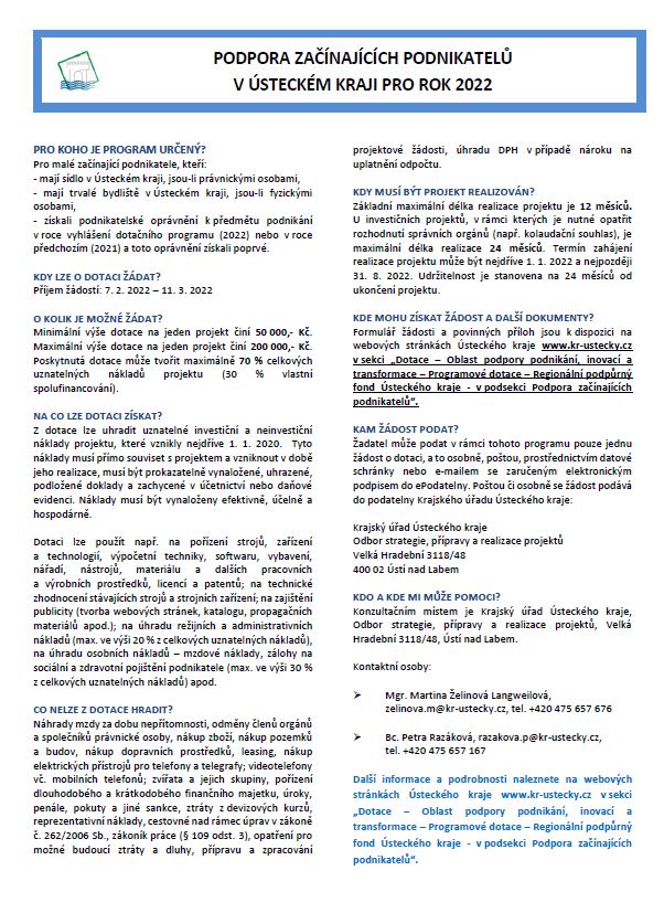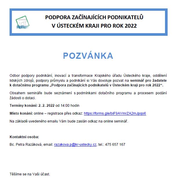 Podpora začínajících podnikatelů pro rok 2022 Ústecký kraj vyhlásil dotační program „Podpora začínajících podnikatelů v Ústeckém kraji pro rok 2022“ Dne 2.2.2022 proběhne seminář k dotačnímu programu :