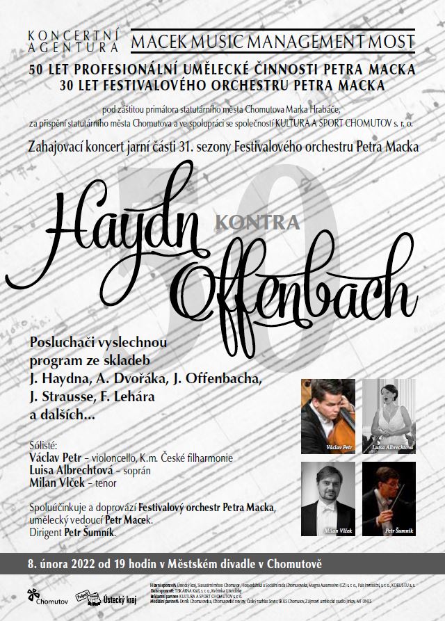 Pozvánka na koncert – Haydn kontra Offenbach Zahajovací koncert jarní části 31. sezony Festivalového orchestru Petra Macka „Haydn kontra Offenbach“ dne 8.2.2022 od 19 hod. v Městském divadle v Chomutově.