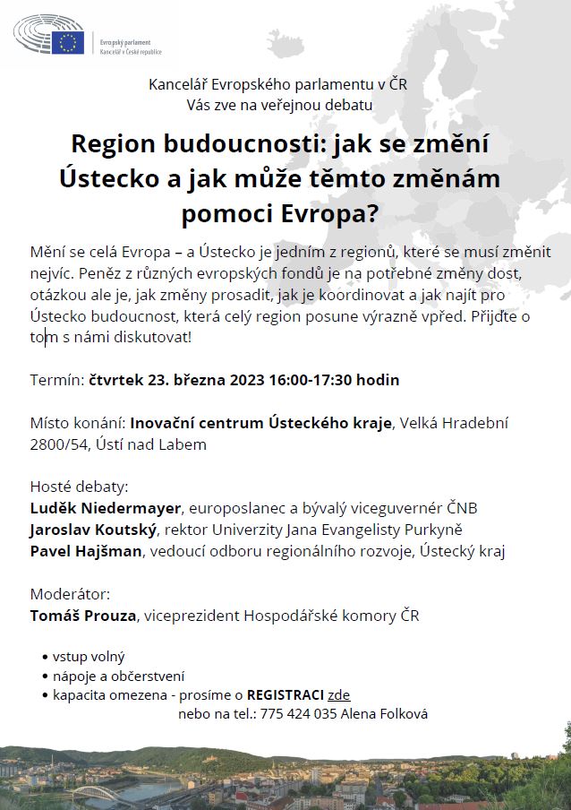 Viceprezident Hospodářské komory České republiky, Tomáš Prouza spolu s rektorem UJEP, Jaroslavem Koutským, Krajským úřadem Ústeckého kraje a Kanceláří Evropského parlamentu pořádají dne 23. 3. 2023 od 16:00 hod. debatu o transformaci Ústeckého kraje, která se uskuteční v prostorách Inovačního centra Ústeckého kraje.