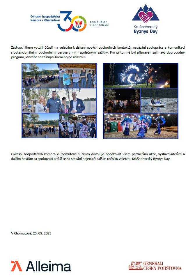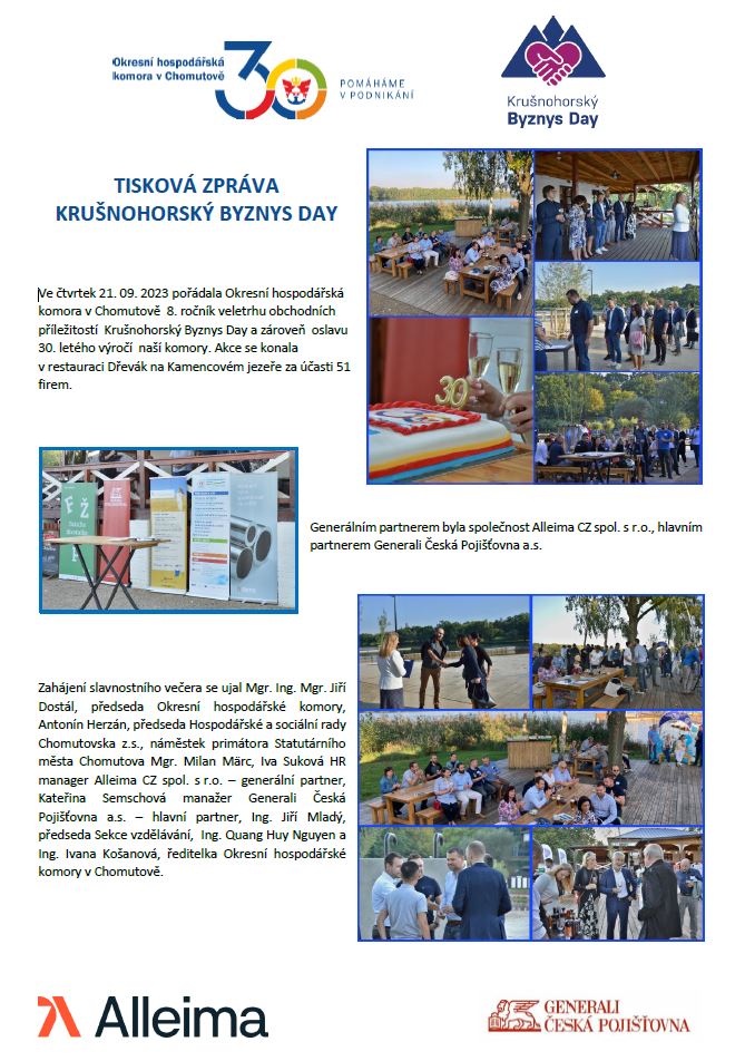 rádi bychom vám poděkovali za účast na 8. ročníku Krušnohorského Byznys Day a zároveň oslavu 30. výročí Okresní hospodářské komory v Chomutově.