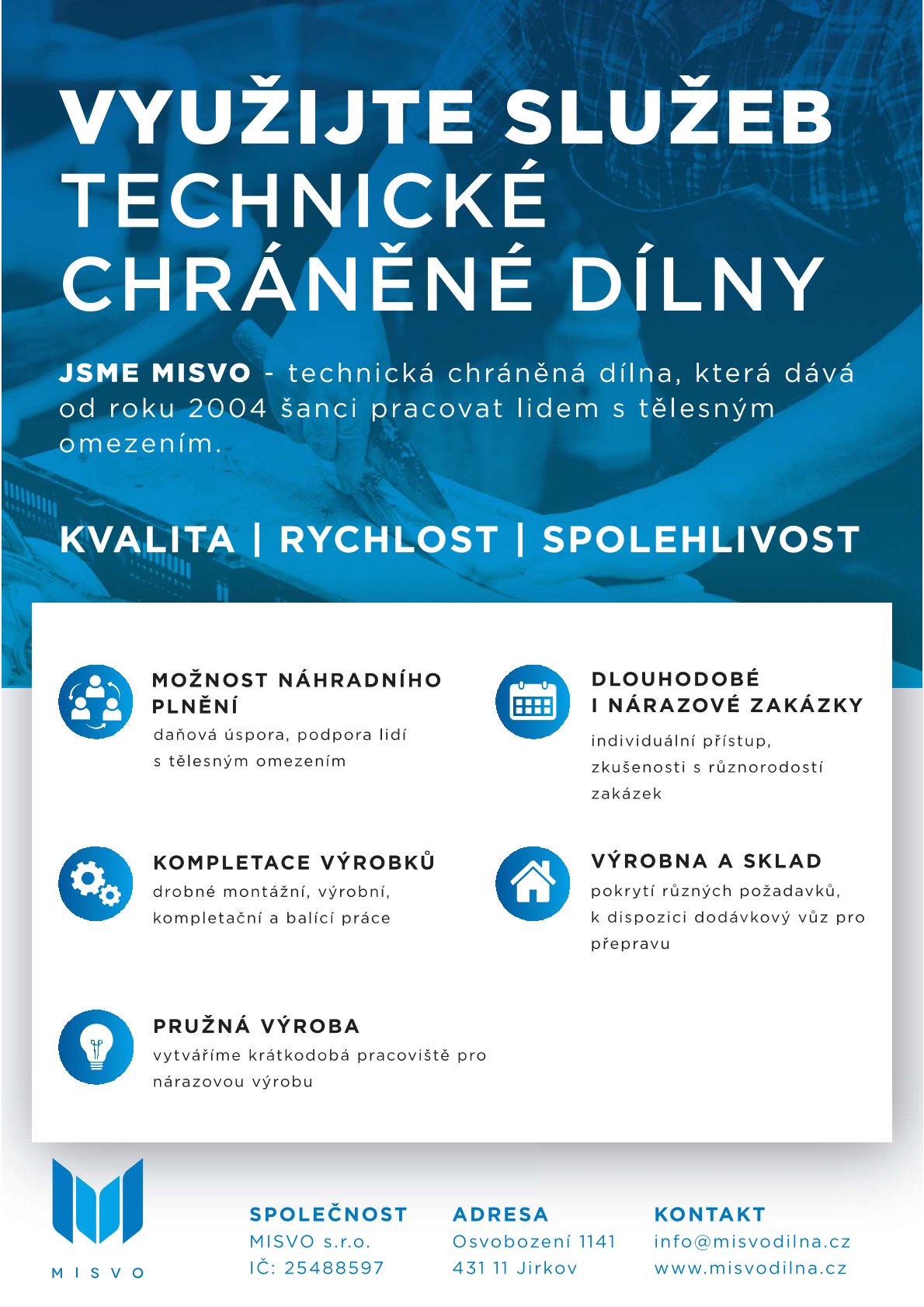 Pokud ne, tak využijte služeb Technické chráněné dílny MISVO ke snížení odvodů do státního rozpočtu odběrem služeb nebo zboží formou Náhradního plnění.