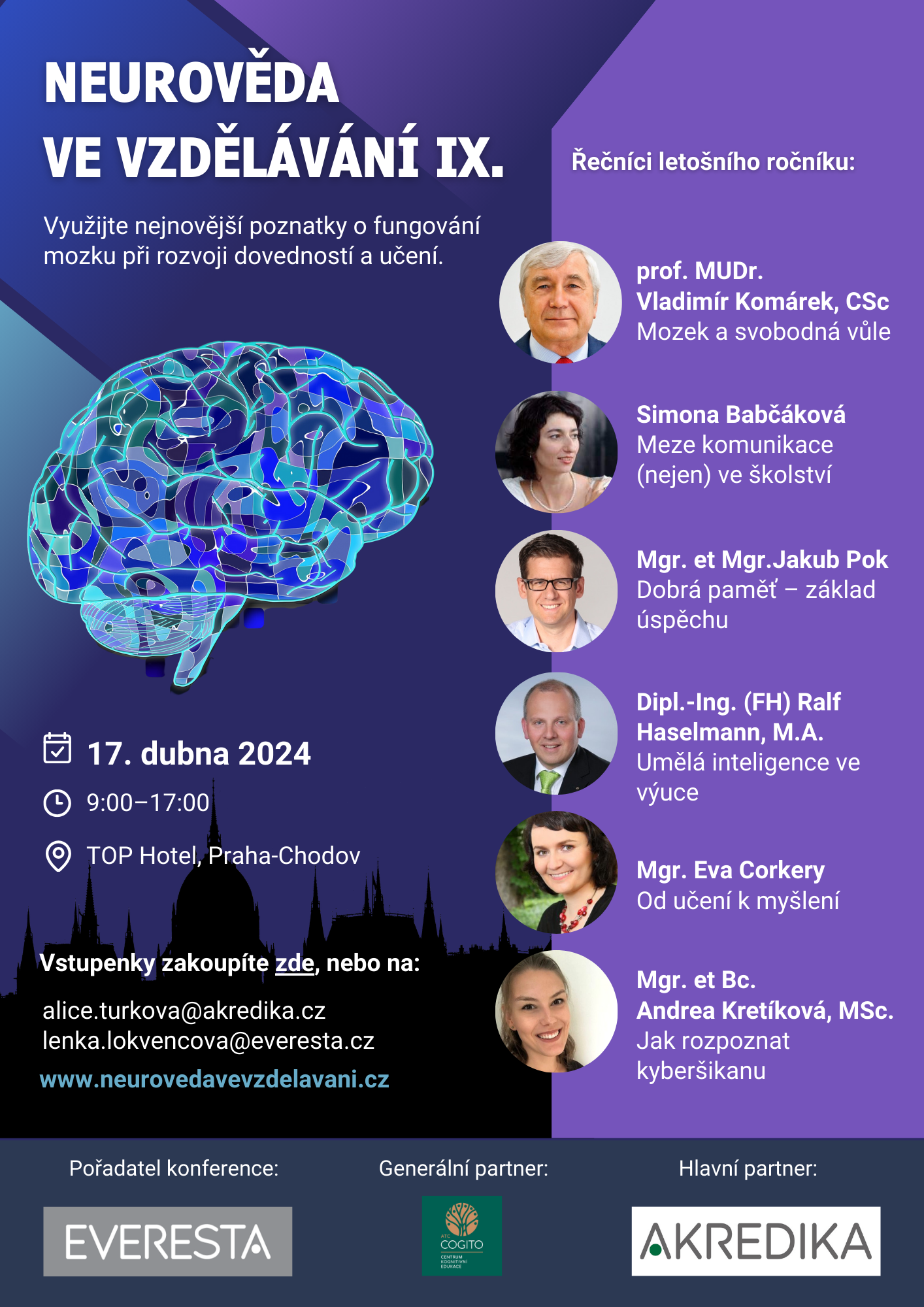 IX. ročník konference Neurověda ve vzdělávání nabídne opět zajímavé přednášky a poznatky napříč vědními obory, na které můžete posléze navázat ve své výuce nebo při svém vlastním procesu učení a získávání znalostí.