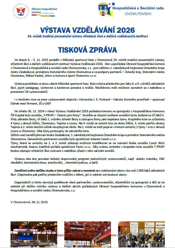 Ve dnech 4. – 5. 11. 2025 proběhl v Městské sportovní hale v Chomutově 24. ročník tradiční prezentační výstavy středních škol a dalších vzdělávacích institucí Vzdělávání 2026. Akci uspořádala Okresní hospodářská komora v Chomutově a Hospodářská a sociální rada Chomutovska, z.s. pod záštitou 1. náměstkyně hejtmana Ústeckého kraje Jindry Zalabákové, primátora Statutárního města Chomutova a za podpory partnerů – Ústecký kraj, Statutární město Chomutov, Město Kadaň, Jirkov a Kultura a Sport Chomutov s.r.o.